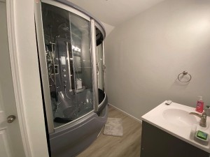 1 non-smoking bedroom with king bed, full bathroom with Valencia spa shower/hot tub, full kitchen with all the amenities, living room with queen sofa sleeper and a 65-inch TV.
